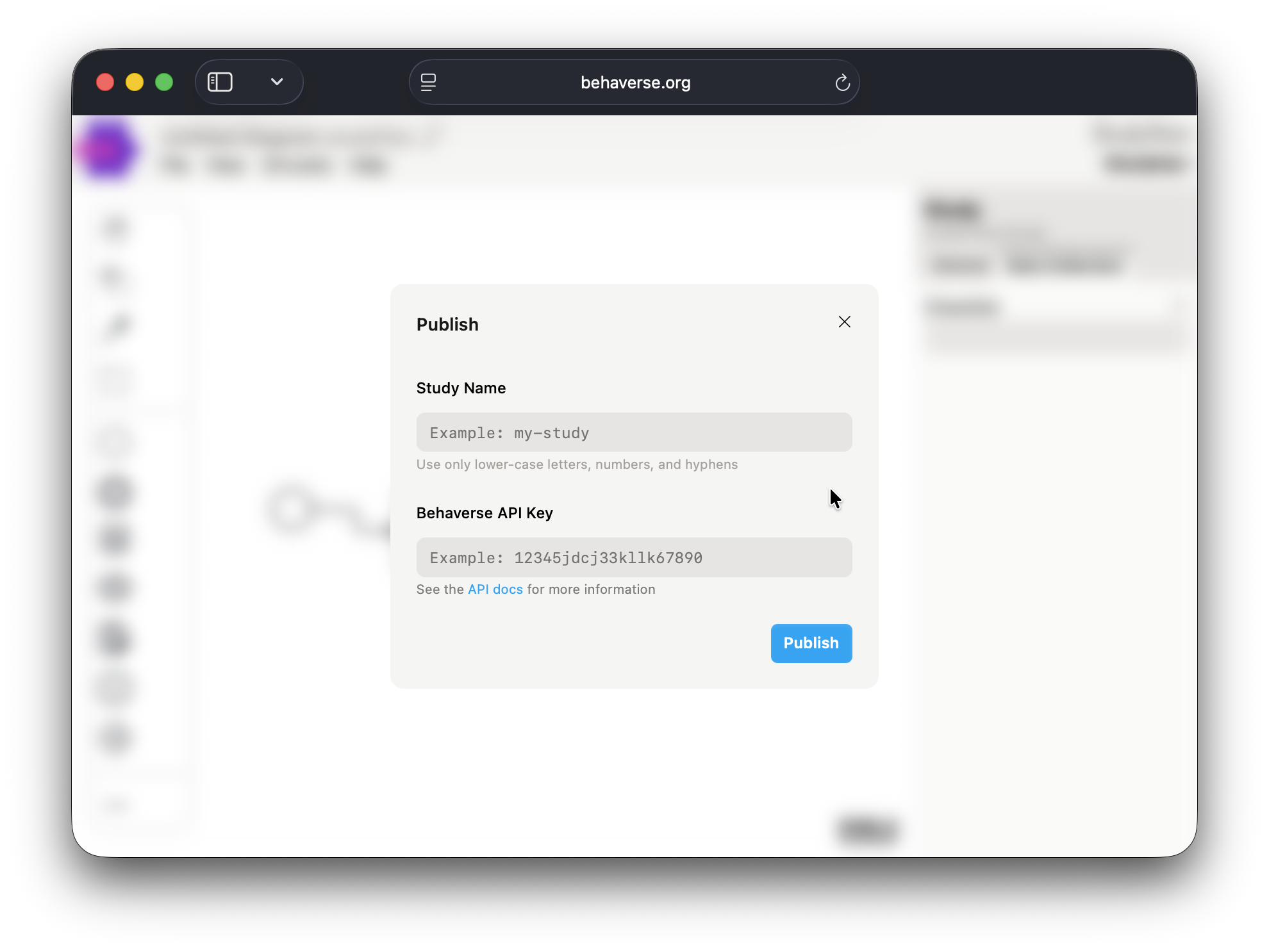 If you have a Behaverse API key, you can publish your studyflow diagram directly to the Behaverse Data Server. Use the “Publish” option in the “File” menu to upload your diagram.